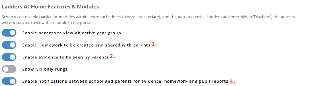 Only admin users are able to access the settings tab in Ladders at Home. EYFS and KS1+ have separate settings for Ladders at Home.