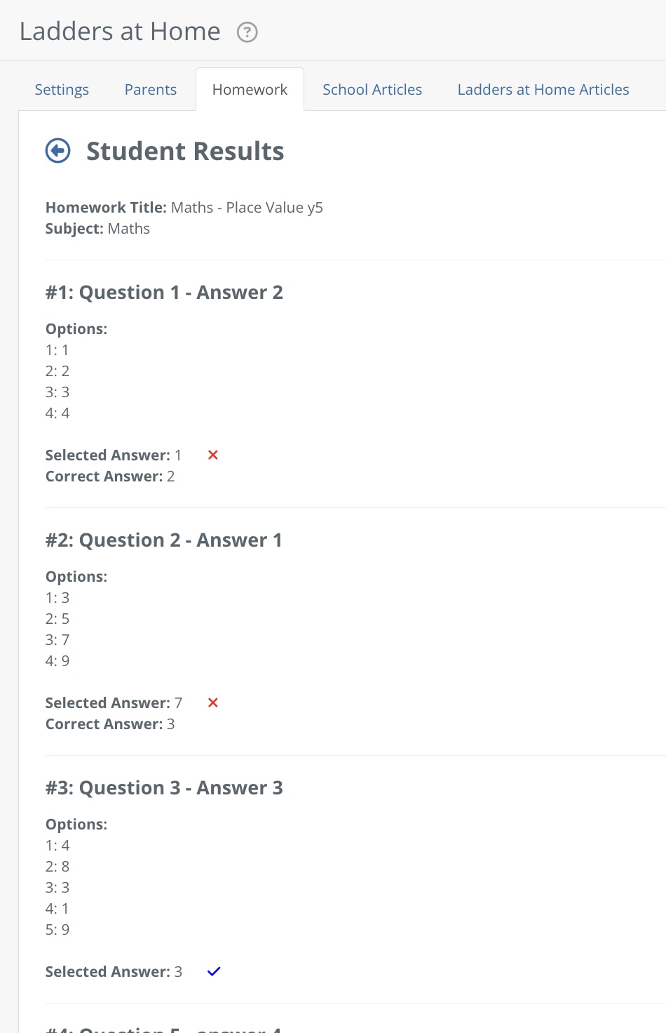 After the child submits the homework, the parent can view a result (if multiple choice).