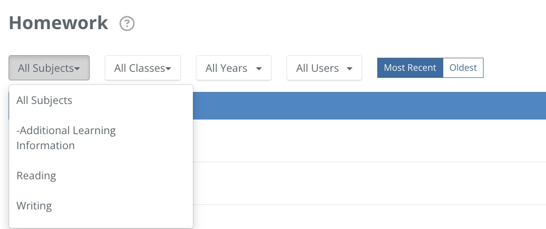 You are able to see all of the Homework that has been created by yourself (Admins can see all homework within the school).