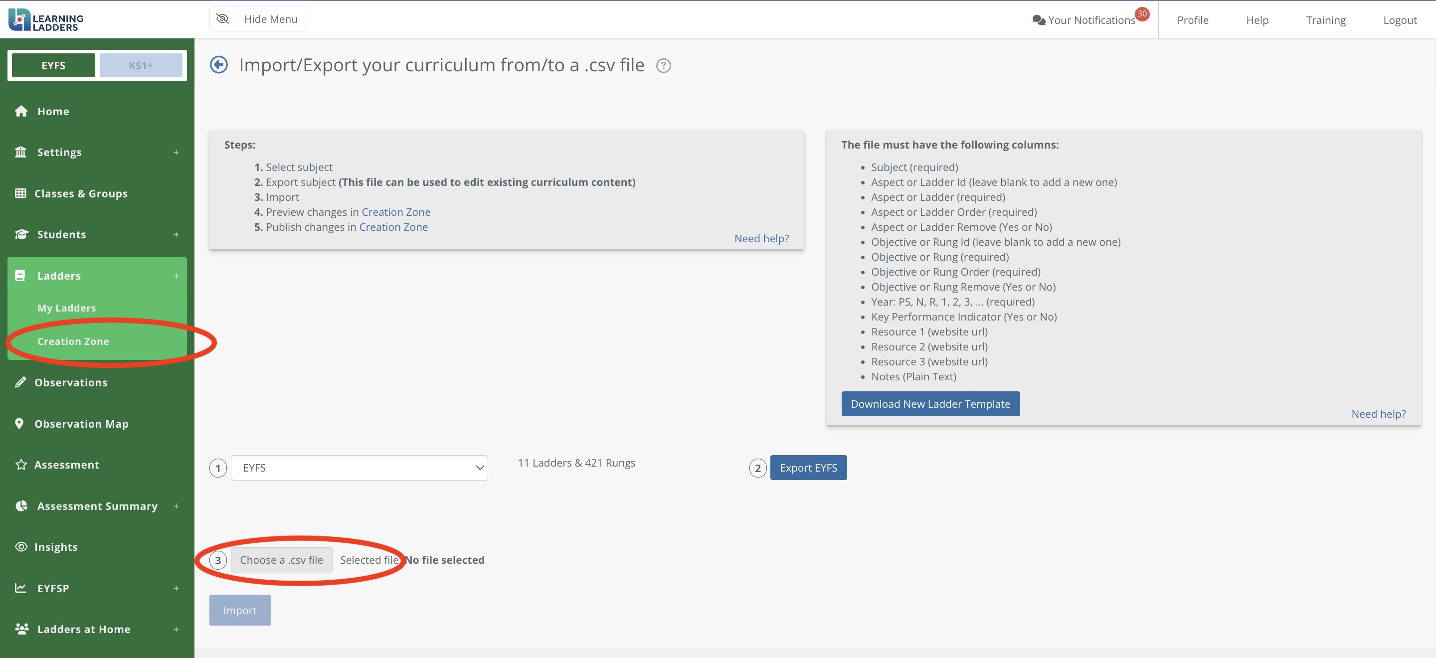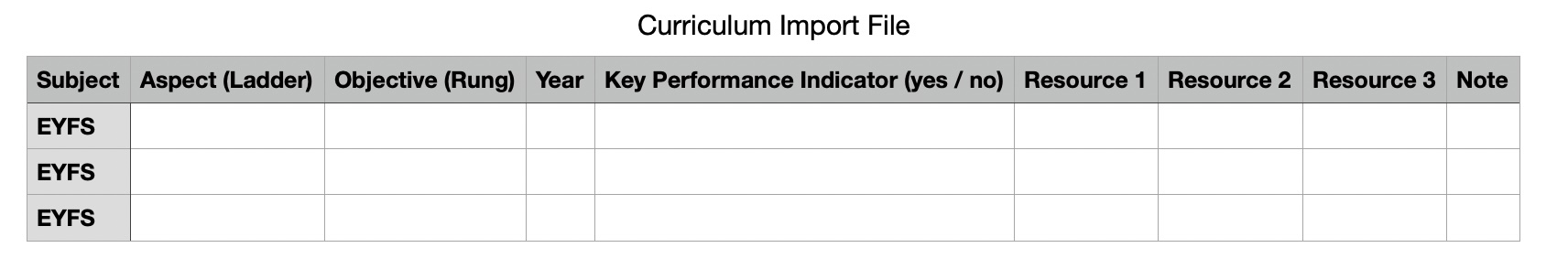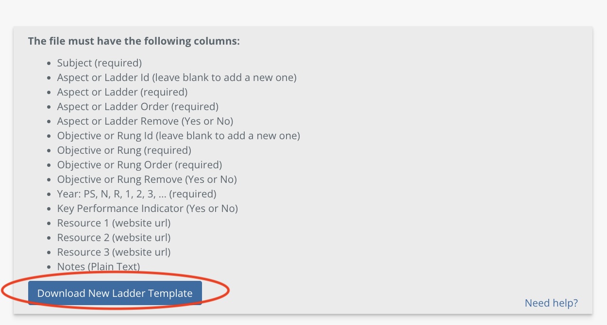 Please note: You are not able to amend existing ladders/rungs using an import file. You can create new ladders and new rungs. You are also able to add in notes and up to 3 resources.