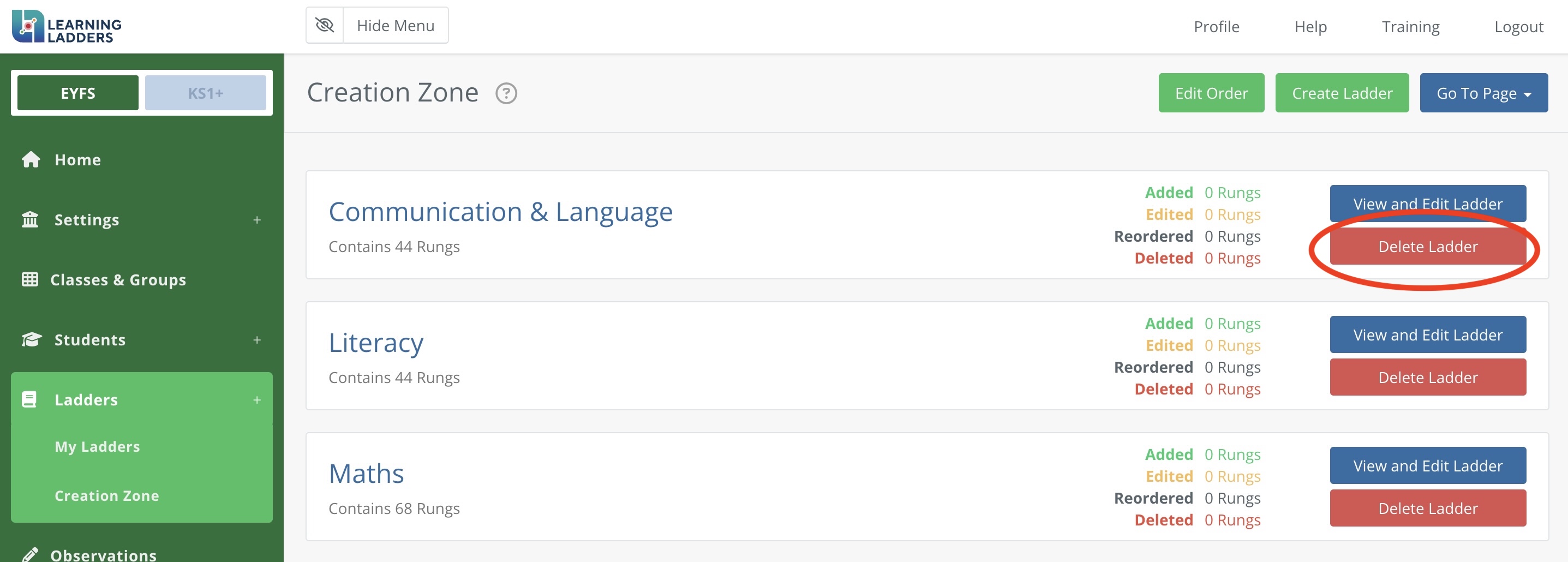 All changes will go into the Creation Zone where they need to be reviewed and published. The new Ladders or rungs will not be visible in 'My Ladders' until this has been done.