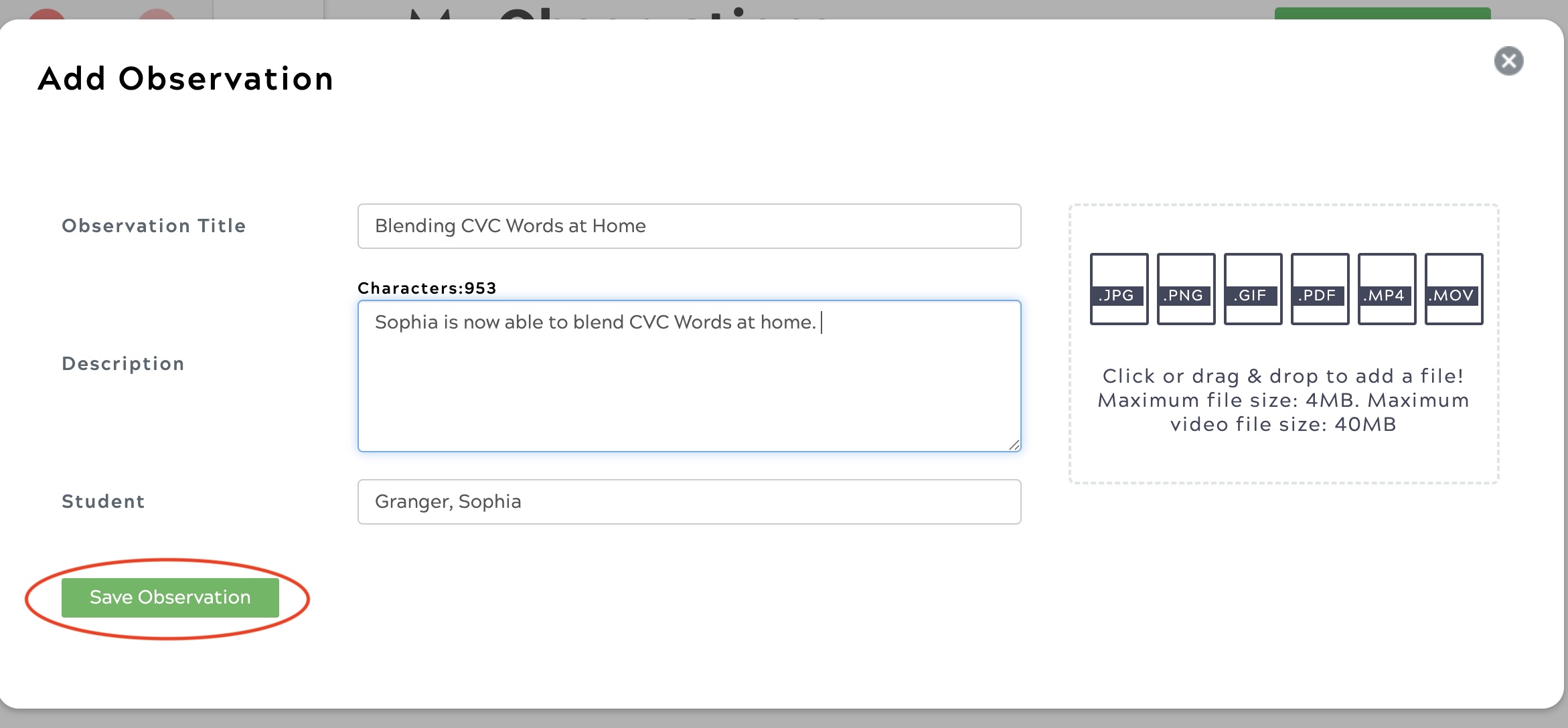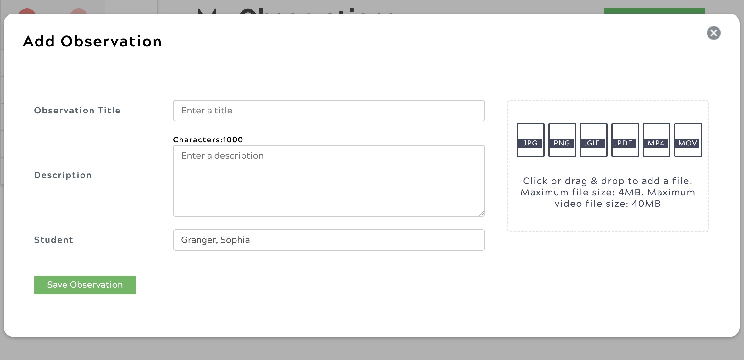 The parent provides an observation title and description for the observation. The student's name is automatically pulled in.