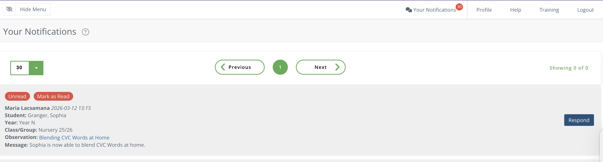 Teachers can respond to an observation shared by clicking on 'Respond'.