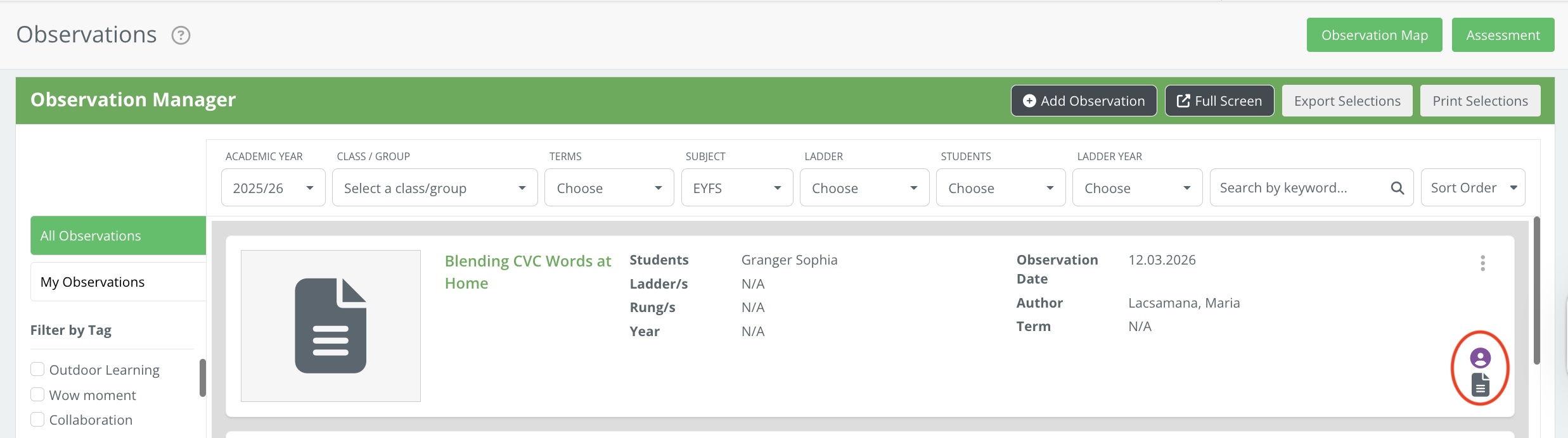 Parent observations can be viewed in the Observation Manager.