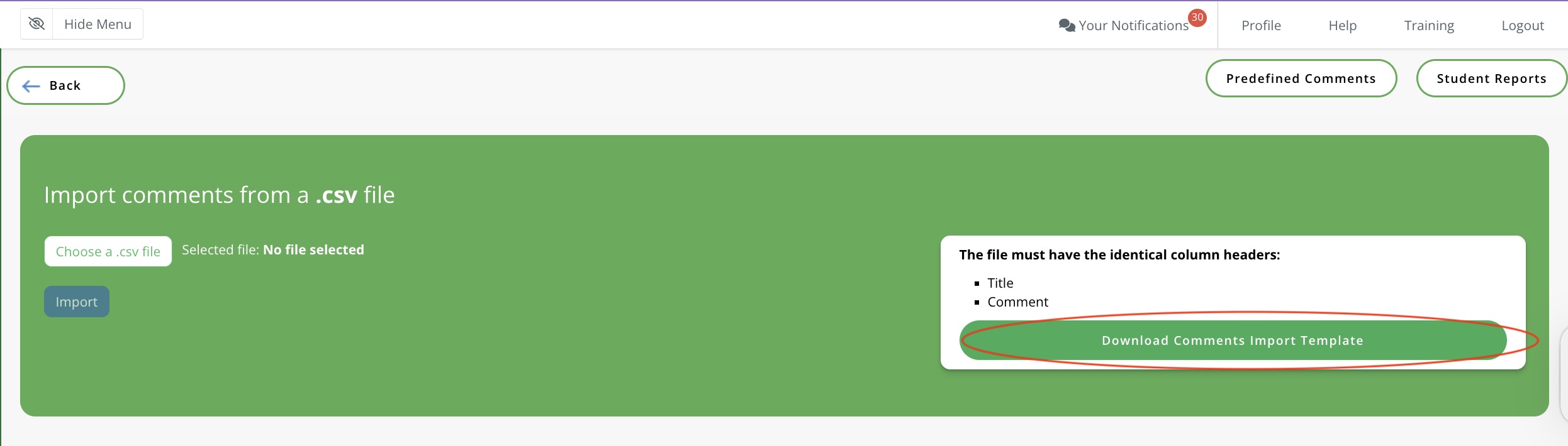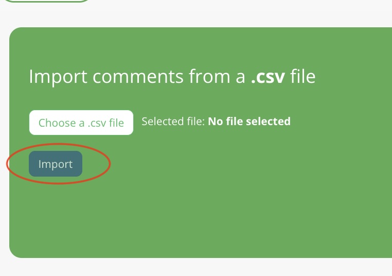 Click on 'Download Comments Import Template'. This will download a .csv file with the headers 'title' and 'comment'. Fill in the columns with the title and corresponding comment (30 max) and save the file (this must be .csv format).
