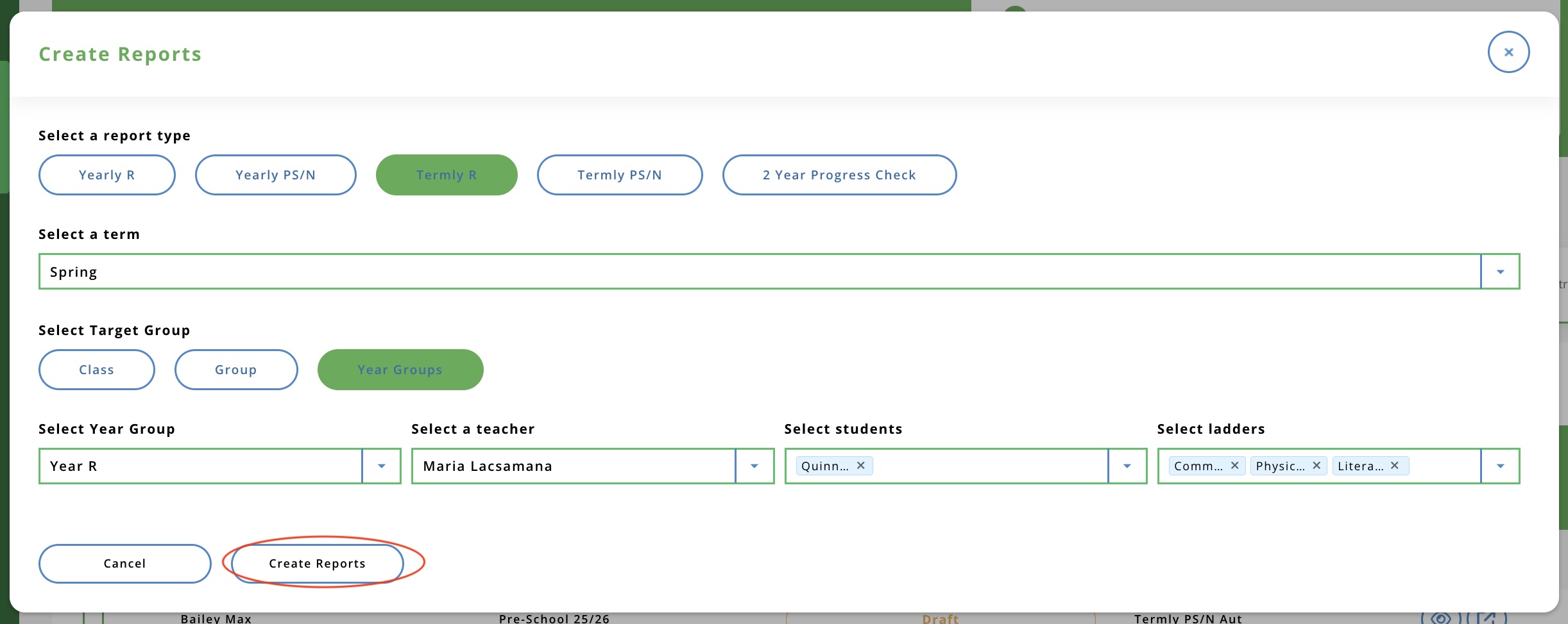 EYFS Student Reports: Create New Student Reports
