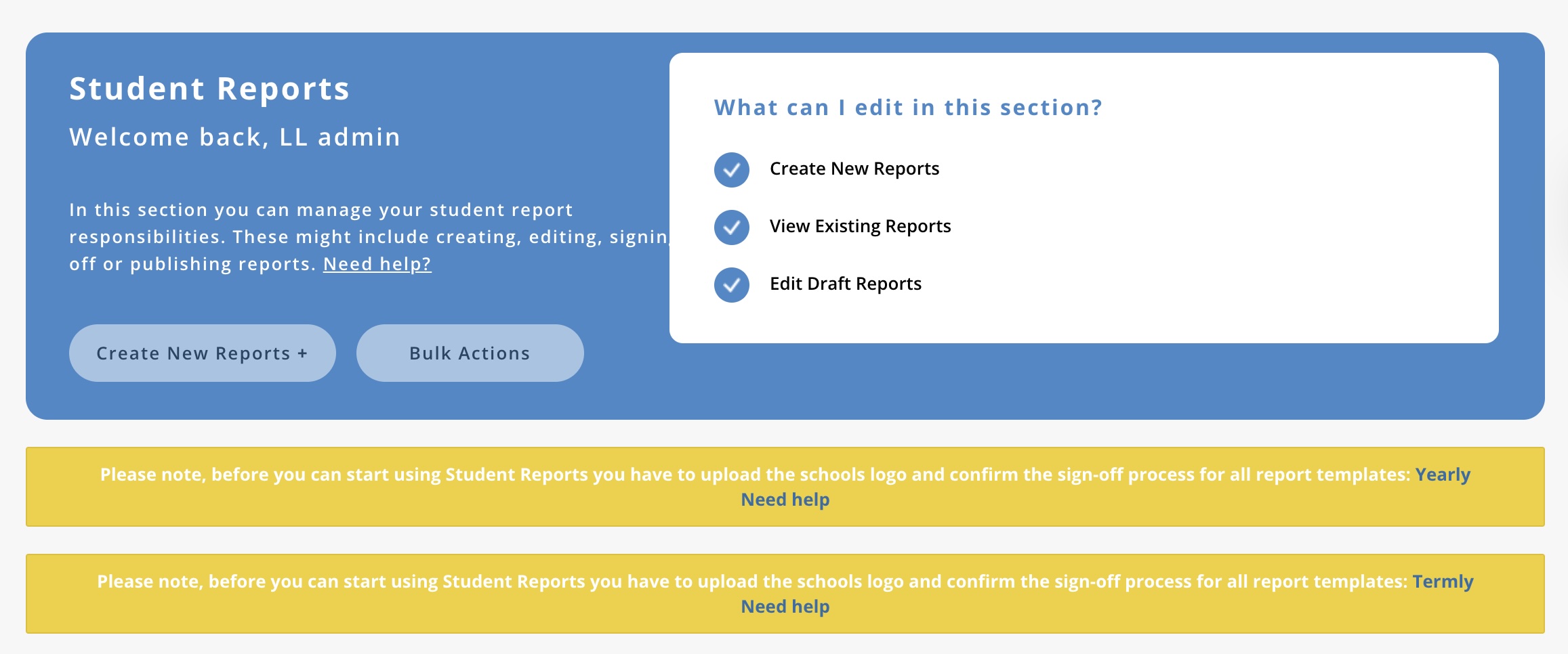 Before teachers can create student reports, the admin user must upload the school's logo and set sign-off settings.