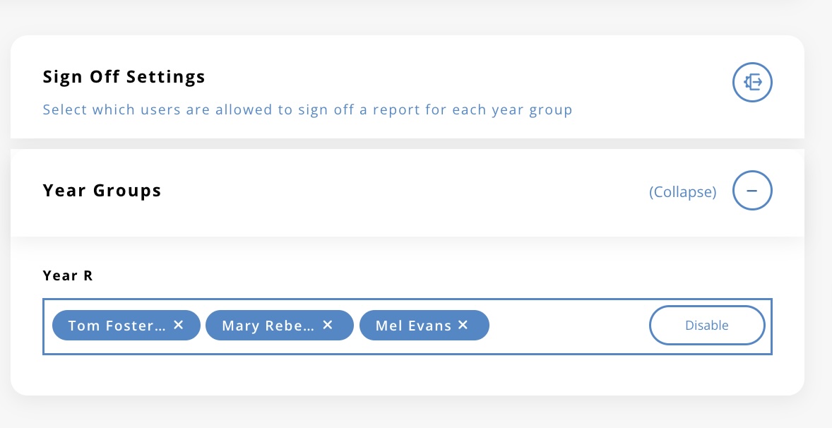 Select which users in the Learning Ladders system are allowed to sign off a report for each live year group.
