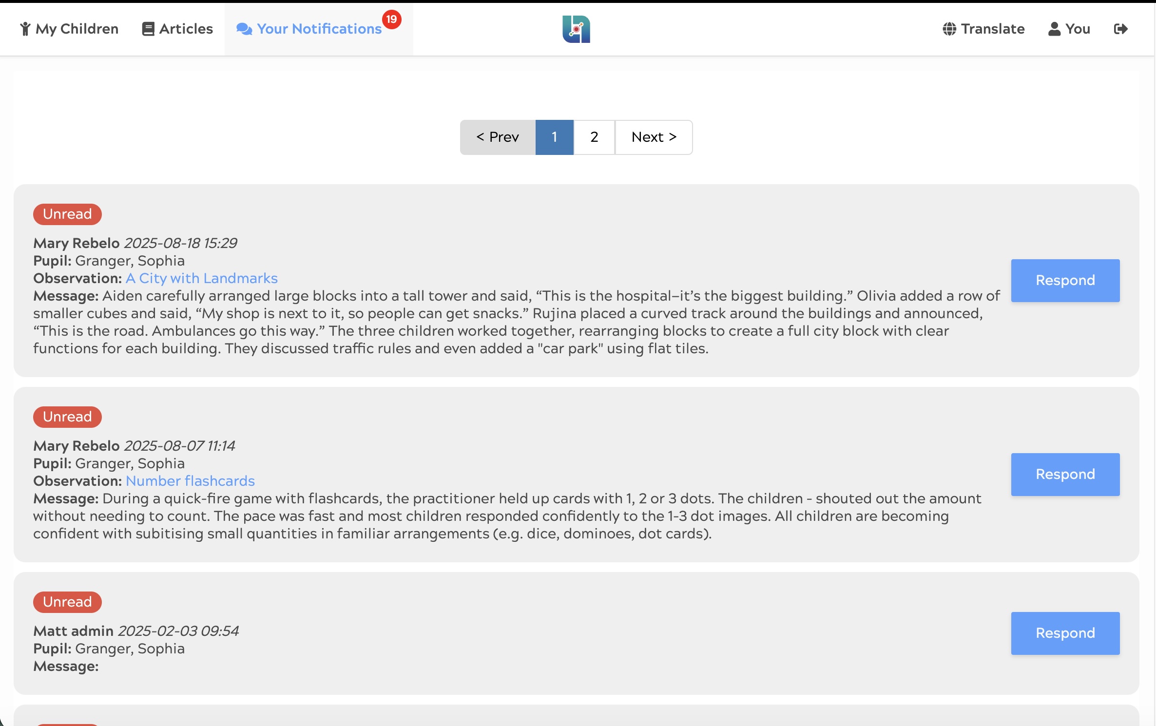After an observation or piece of homework is shared, the parent can choose to 'respond' and begin a two-way conversation.