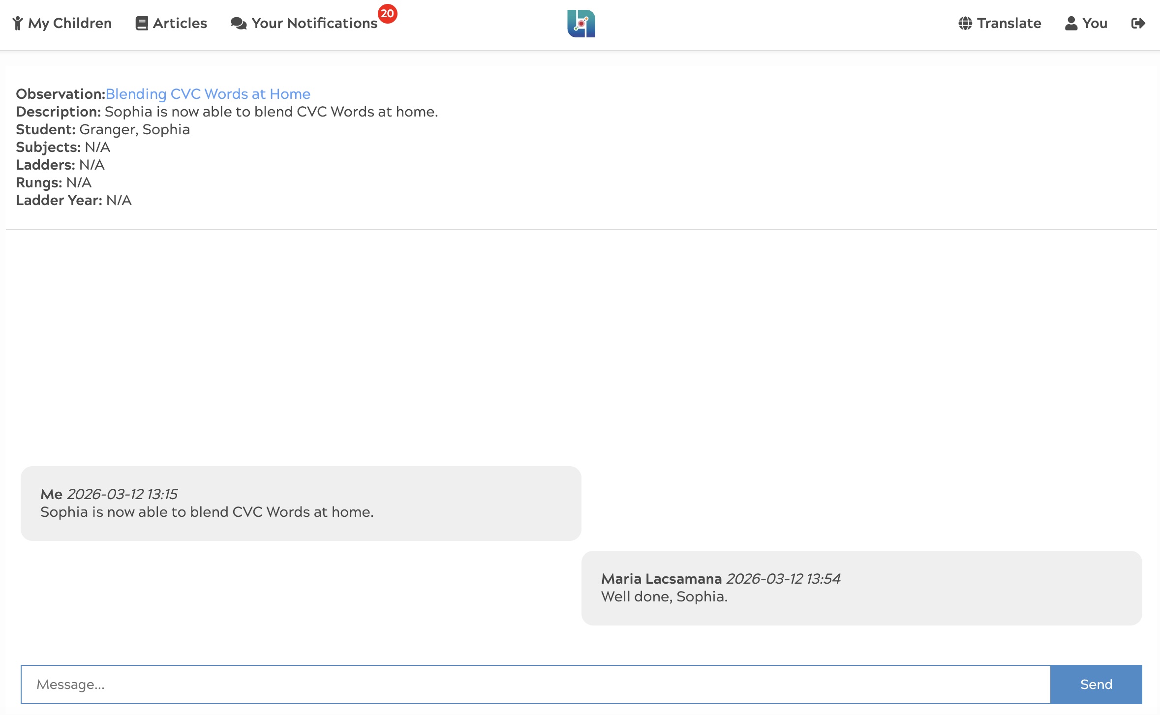 When enabled, communication is easily managed using a 'Notifications' feature for both the teacher (within Learning Ladders) and the parent (in Ladders at Home).