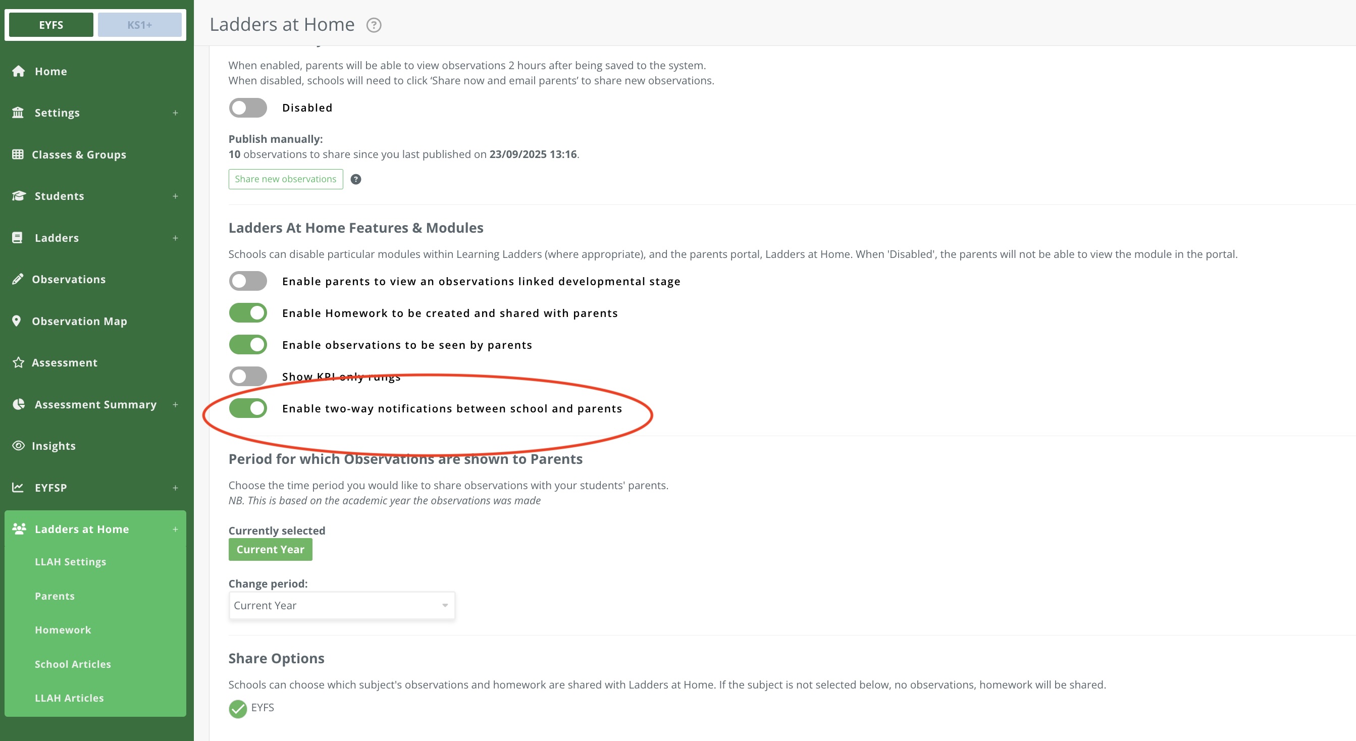 Schools can decide to 'enable' two-way notifications between teachers and parents. An admin user clicks on 'Ladders at Home' and scrolls down the settings to this toggle: