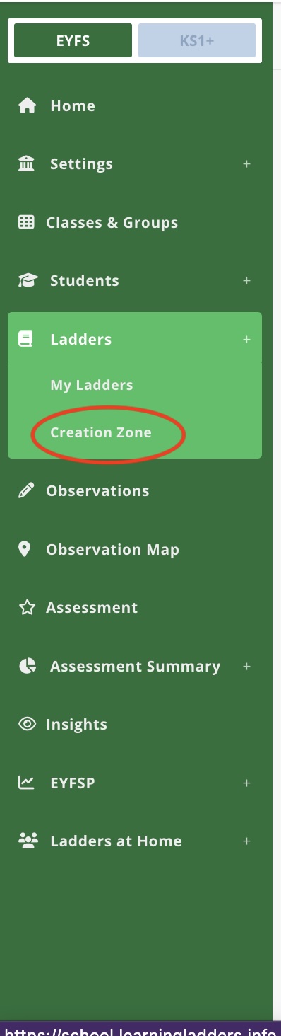 Only admin users have access to the Creation Zone. Teacher users can only view Ladders which have been published and have only the 'Ladders' button on their green menu.