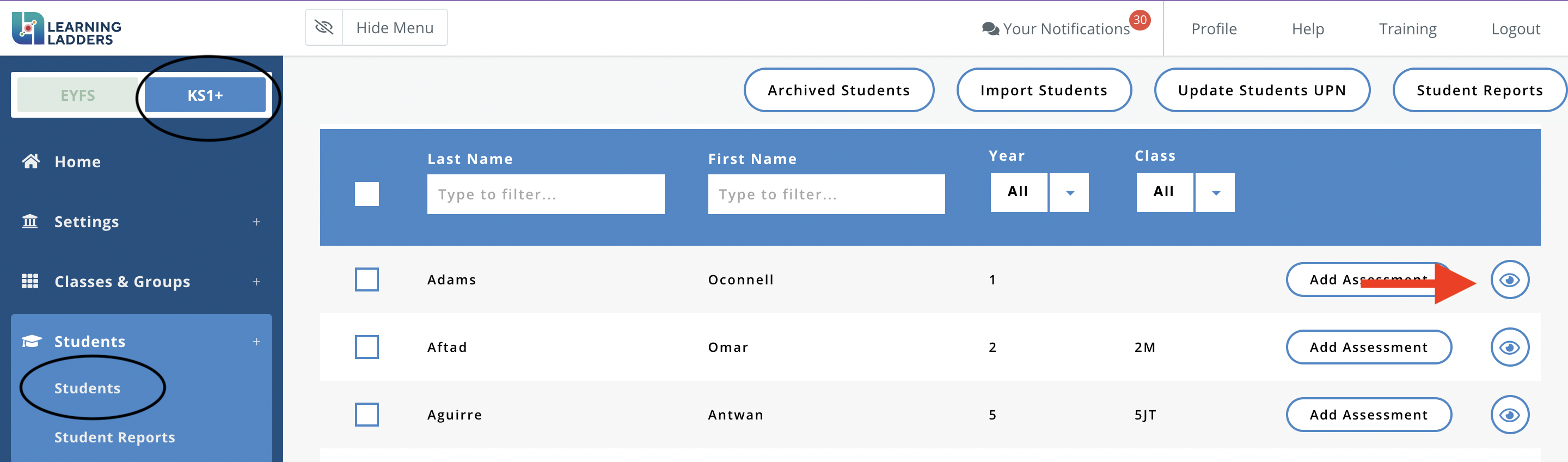 4. To assign a student to a new class, click KS1+, then Students > Students. Look for the student and click the 'eye icon'.