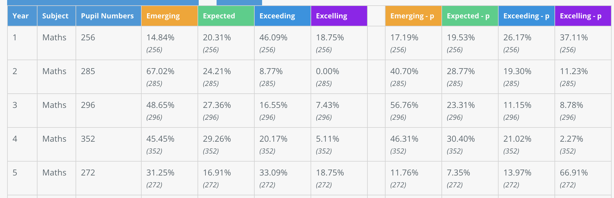 If you slide the toggle 'View pupil numbers', the table displays the number of students achieving each descriptor in brackets below the percentage.