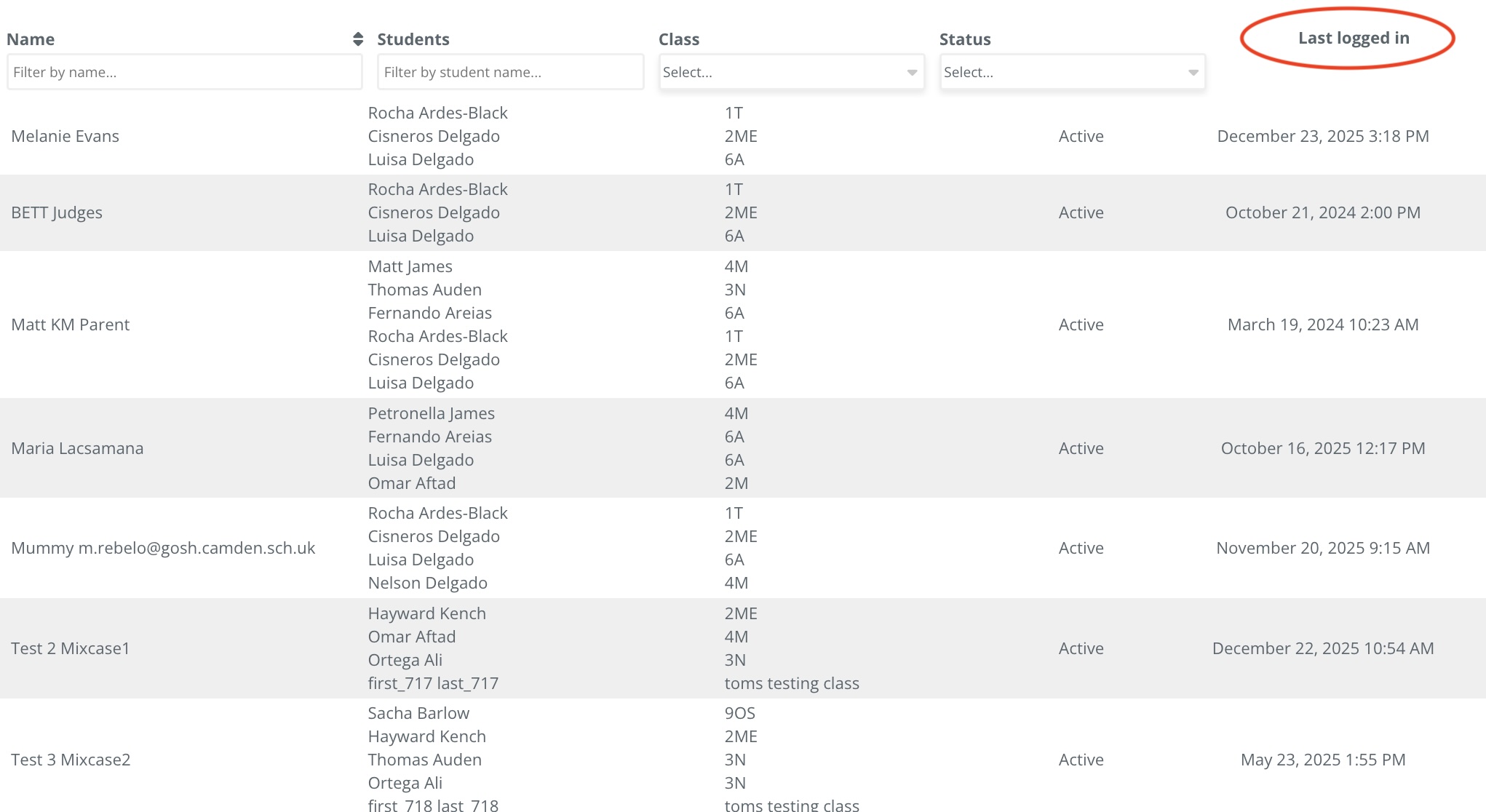 This screen offers information about 'Last logged in' to see whether parents have successfully logged in to view their child's learning.