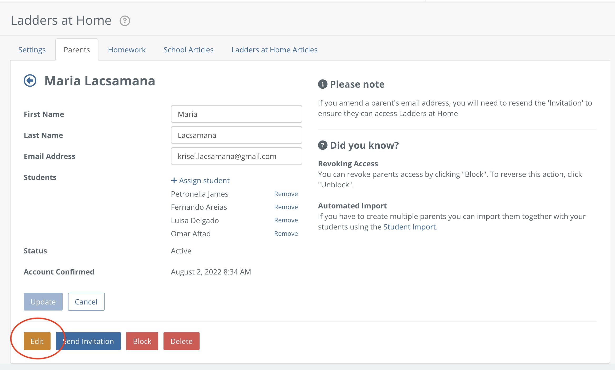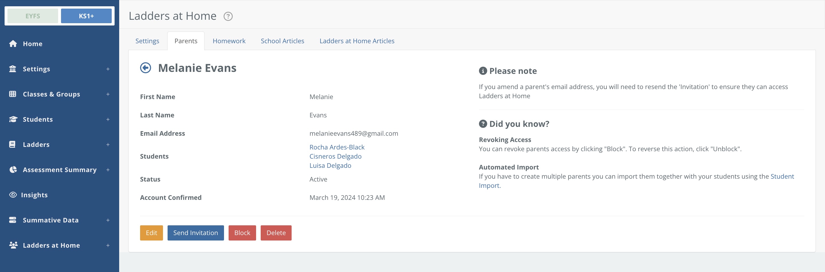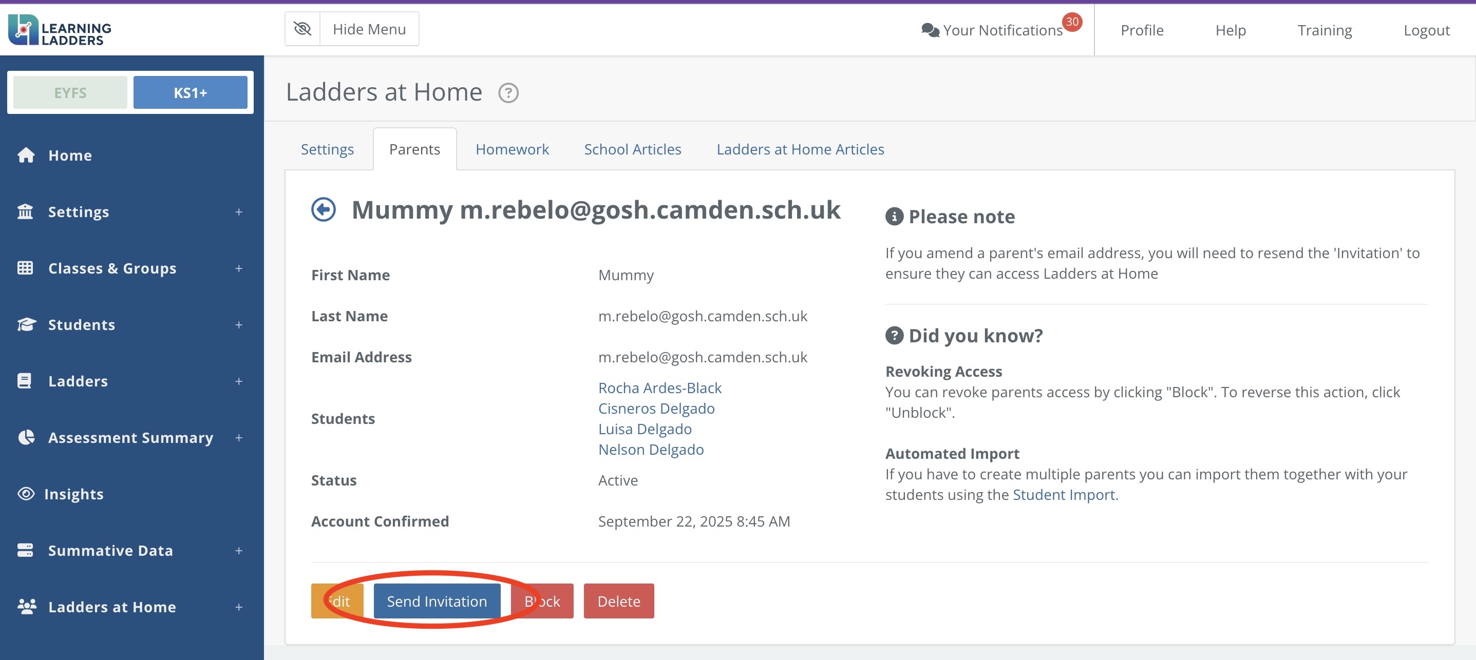 This will allow you to see all the parent's information. Click ‘Send Invitation’ which will generate an email to the parent allowing them to set up their Ladders at Home logins.