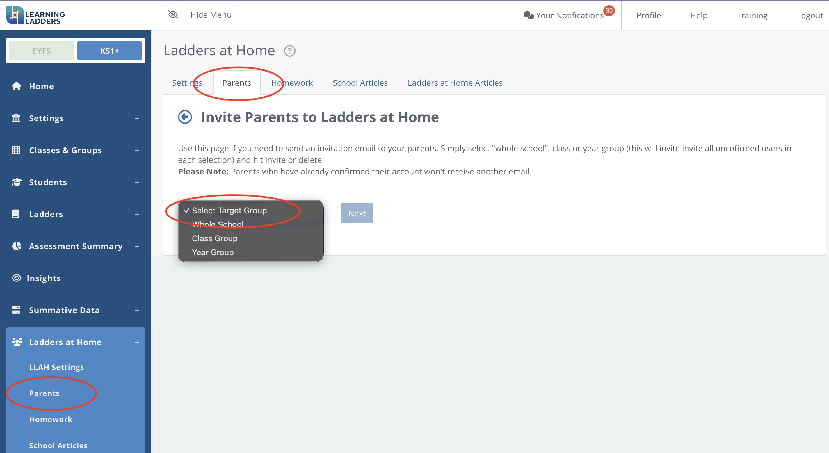 All imported/synced parents across the school will appear in the 'Parents' tab within Ladders at Home. Schools are able to select only the parents they wish to invite.